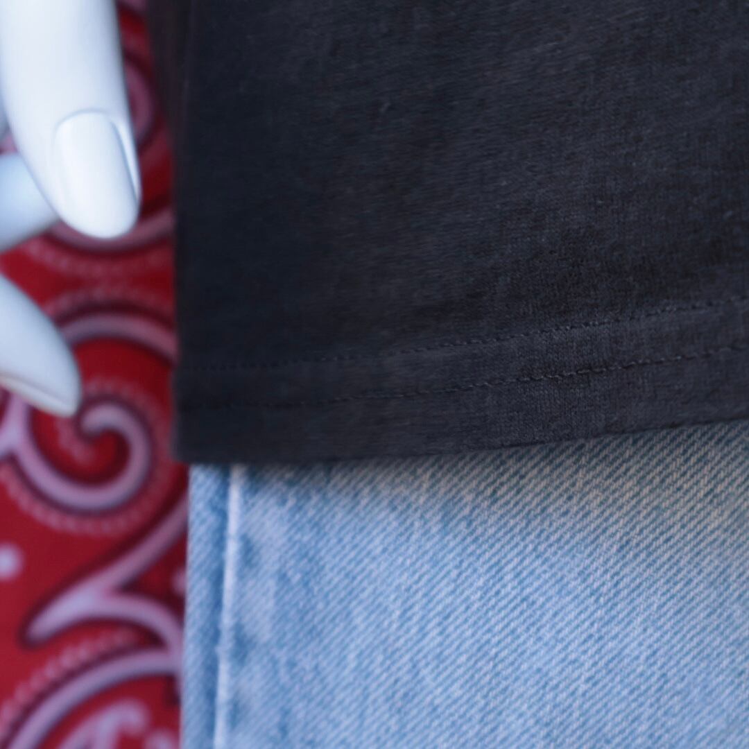 袖/裾共にダブルステッチ、丸胴
